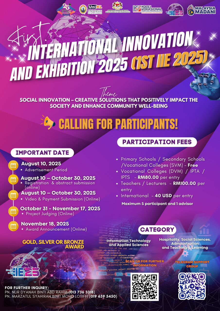 The First International Innovation and Exhibition 2025 (1st IIE 2025) is a prestigious international-level competition organized by Kolej Vokasional Kuala Selangor, in collaboration with the Bahagian Pendidikan dan Latihan Teknikal dan Vokasional (BPLTV) and Universiti Kuala Lumpur Malaysian Institute of Information Technology (UniKL MIIT). This competition is aligned with the aspirations of the Fourth Industrial Revolution (IR 4.0), which signifies a transformative shift in the way we live, work, and innovate.